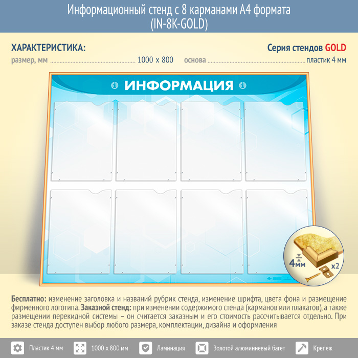 Информационный стенд с 8 карманами А4 формата (IN-8K-GOLD) в Великом Новгороде купить