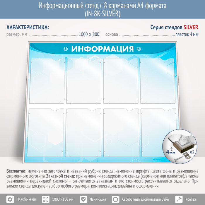 Информационный стенд с 8 карманами А4 формата (IN-8K-SILVER) в Великом Новгороде купить