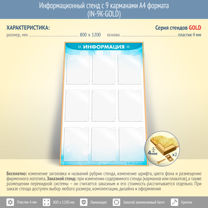 Информационный стенд с 9 карманами А4 формата (IN-9K-GOLD) в Великом Новгороде купить