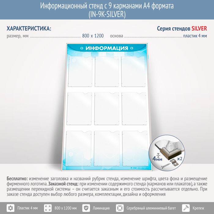 Информационный стенд с 9 карманами А4 формата (IN-9K-SILVER) в Великом Новгороде купить