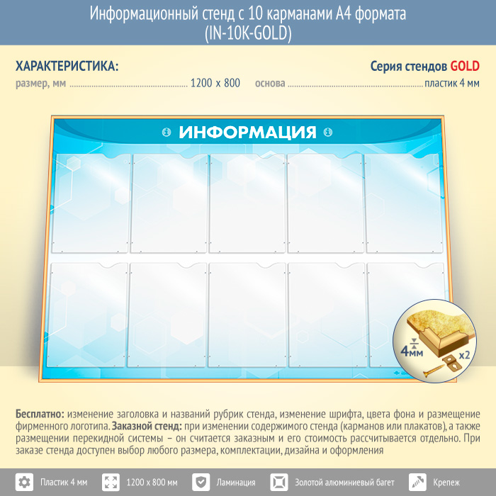 Информационный стенд с 10 карманами А4 формата (IN-10K-GOLD) в Великом Новгороде купить