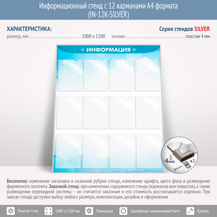 Информационный стенд с 12 карманами А4 формата (IN-12K-SILVER) в Великом Новгороде купить