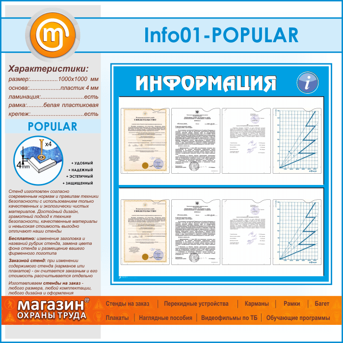 Стенд «Информация» с 8 карманами А4 формата (IN-01-POPULAR) в Великом Новгороде купить