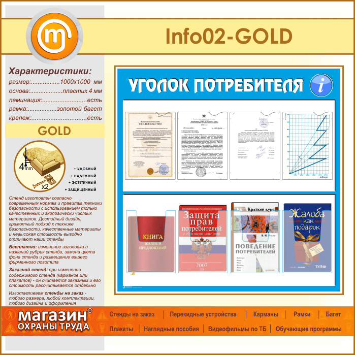 Стенд «Уголок потребителя» с 4 плоскими и 4 объемными карманами А4 формата (IN-02-GOLD) в Великом Новгороде купить