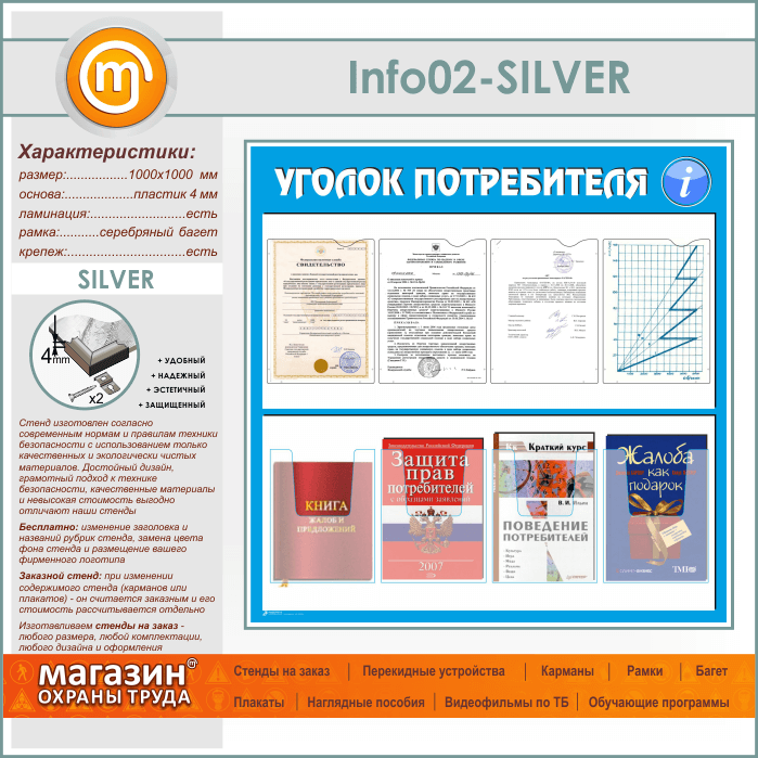 Стенд «Уголок потребителя» с 4 плоскими и 4 объемными карманами А4 формата (IN-02-SILVER) в Великом Новгороде купить