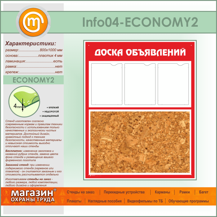 Стенд «Доска объявлений» с пробковым полотном и 3 карманами А4 формата (IN-04-ECONOMY2) в Великом Новгороде купить