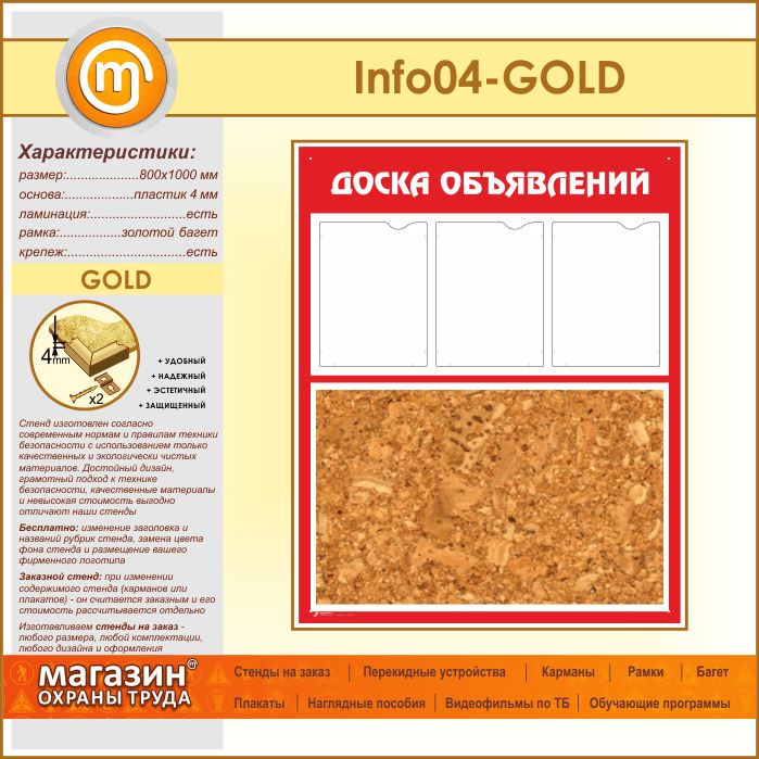 Стенд «Доска объявлений» с пробковым полотном и 3 карманами А4 формата (IN-04-GOLD) в Великом Новгороде купить