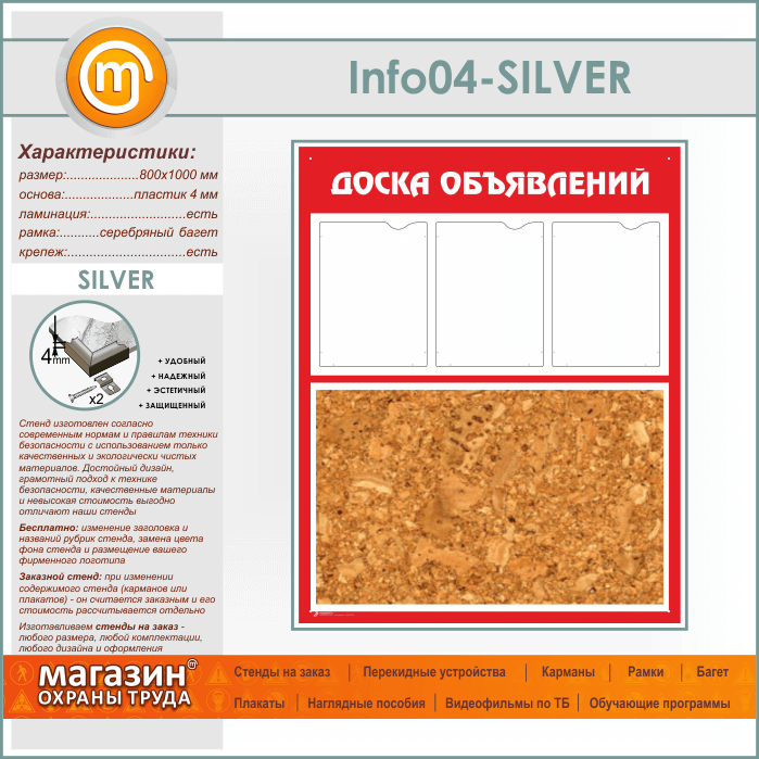 Стенд «Доска объявлений» с пробковым полотном и 3 карманами А4 формата (IN-04-SILVER) в Великом Новгороде купить