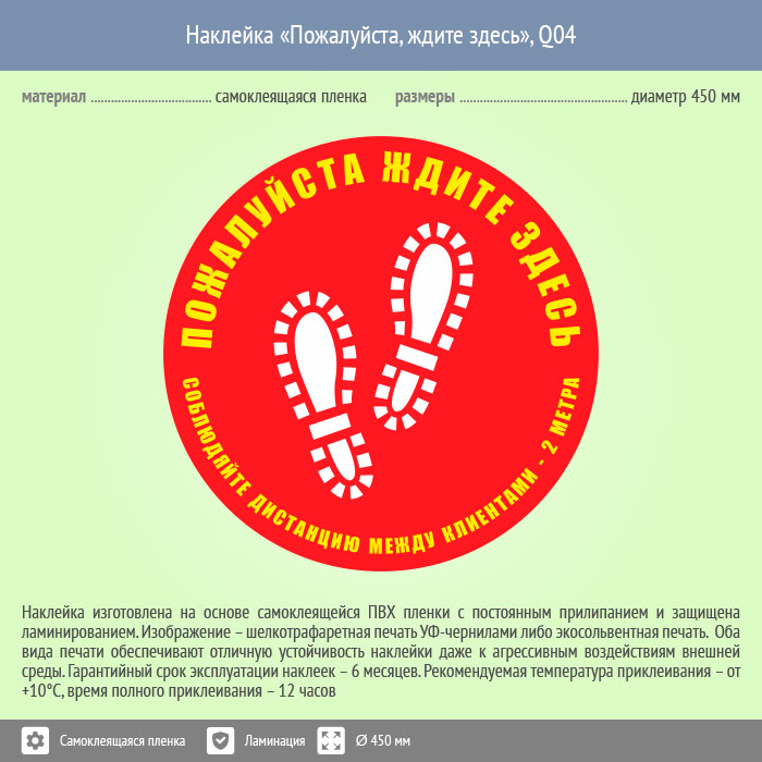 Наклейка на пол «Пожалуйста, ждите здесь», Q04 (пленка c ламинированием, диаметр 450 мм) в Великом Новгороде купить