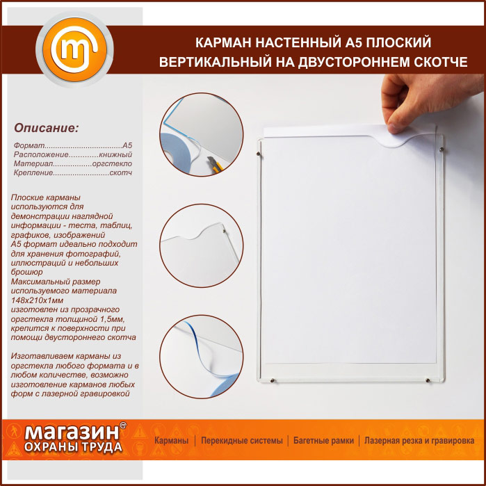 Карман настенный А5 плоский горизонтальный на двустороннем скотче в Великом Новгороде купить