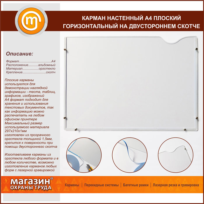 Карман настенный А4 плоский горизонтальный на двустороннем скотче в Великом Новгороде купить