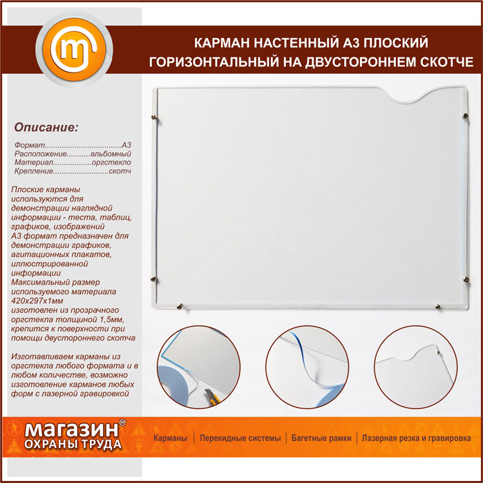 Карман настенный А3 плоский горизонтальный на двустороннем скотче в Великом Новгороде купить