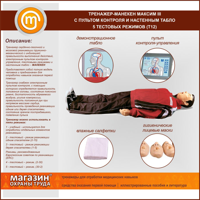 Тренажер-манекен «Максим» III с пультом контроля и управления и настенным табло (Т12) | Тренажер-манекен «Максим» III с пультом контроля и управления и настенным табло (Т12) |