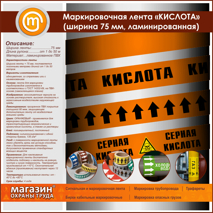 Маркировочная лента «КИСЛОТА» (ширина 75 мм, самоклеящаяся плёнка) в Великом Новгороде купить
