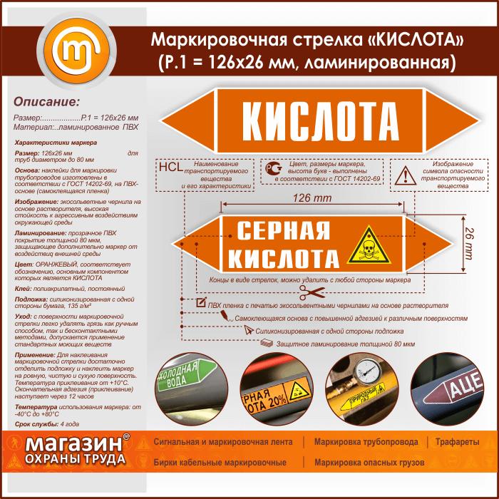 Маркировочная стрелка «КИСЛОТА» (Р.1 = 126х26 мм, самоклеящаяся плёнка с ламинированием) в Великом Новгороде купить
