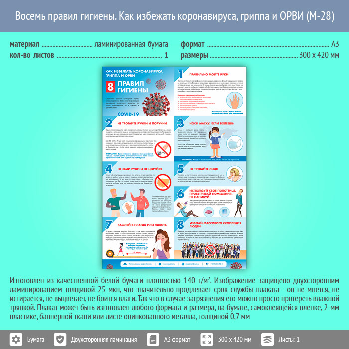 Плакат «Восемь правил гигиены. Как избежать коронавируса, гриппа и ОРВИ» (М-28, ламинированная бумага, А3, 1 лист) в Великом Новгороде купить