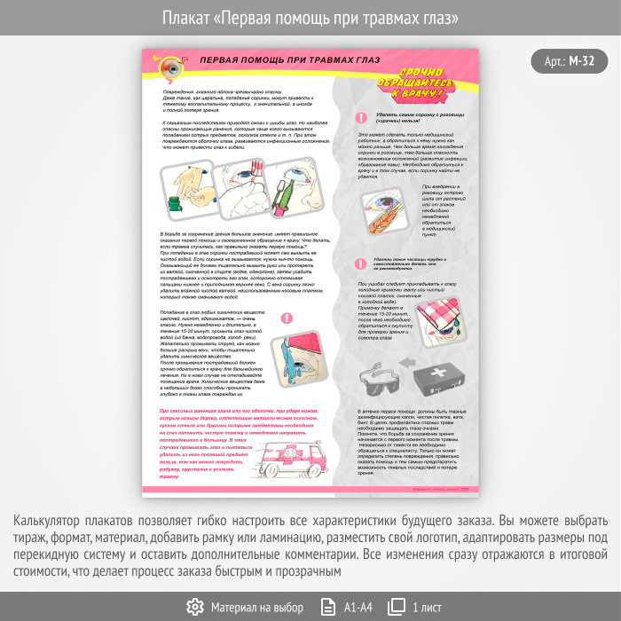 Плакат «Первая помощь при травмах глаз» (М-32, 1 лист) в Великом Новгороде купить