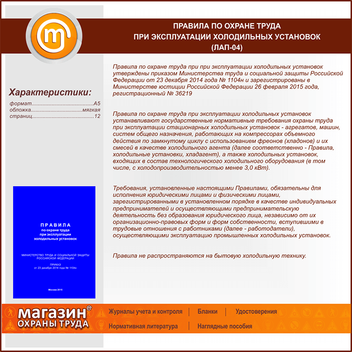 Правила по охране труда при эксплуатации холодильных установок (Приказ Минтруда РФ от 23.12.2014 №1104н) (ЛАП-04) в Великом Новгороде купить