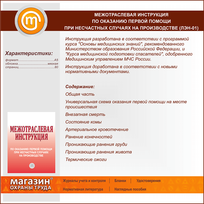 Межотраслевая инструкция по оказанию первой помощи при несчастных случаях на производстве (ЛЭН-01) в Великом Новгороде купить