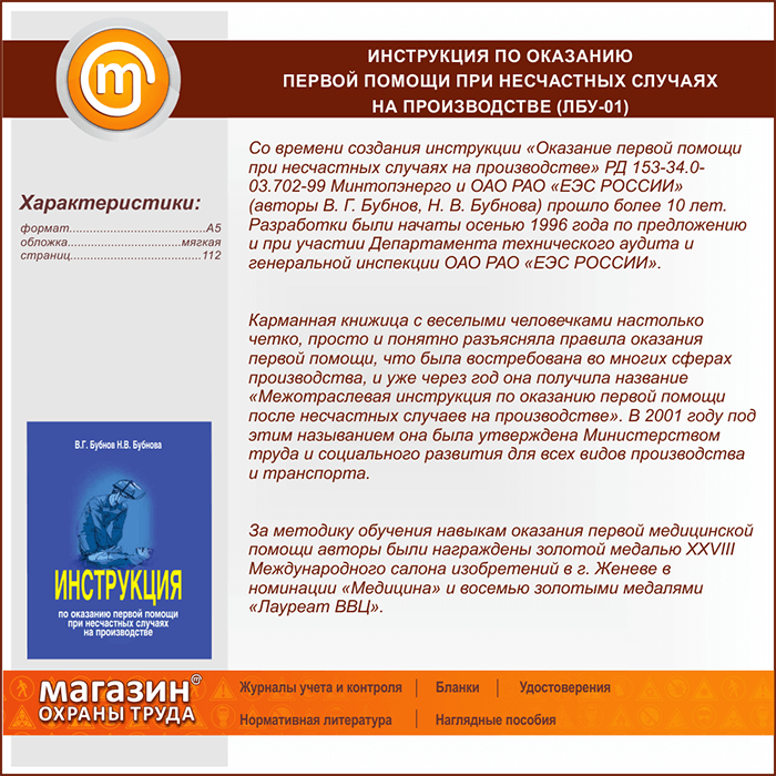 Инструкция по оказанию первой помощи при несчастных случаях на производстве (ЛБУ-01) в Великом Новгороде купить