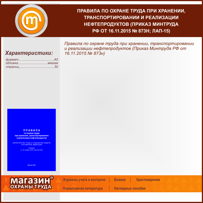 Правила по охране труда при хранении, транспортировании и реализации нефтепродуктов (Приказ Минтруда РФ от 16.11.2015 № 873н) (ЛАП-15) в Великом Новгороде купить