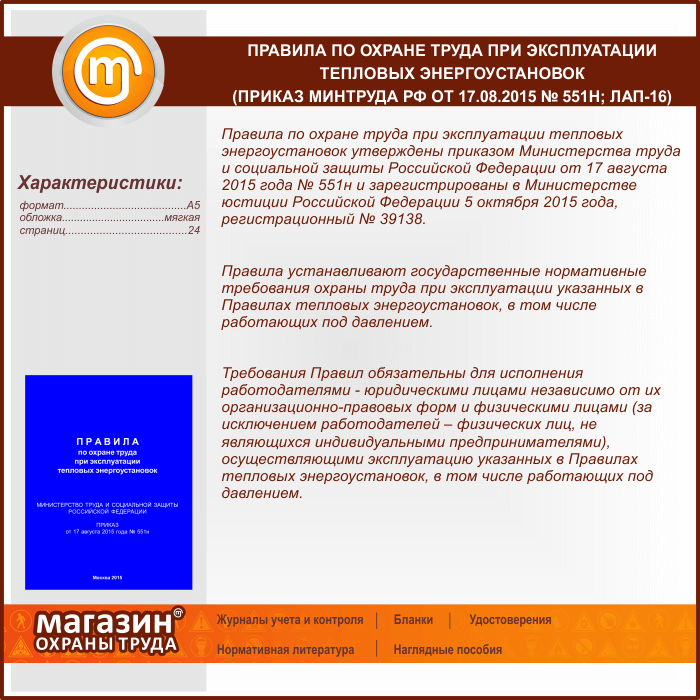 Правила по охране труда при эксплуатации тепловых энергоустановок (Приказ Минтруда РФ от 17.08.2015 № 551н) (ЛАП-16) в Великом Новгороде купить