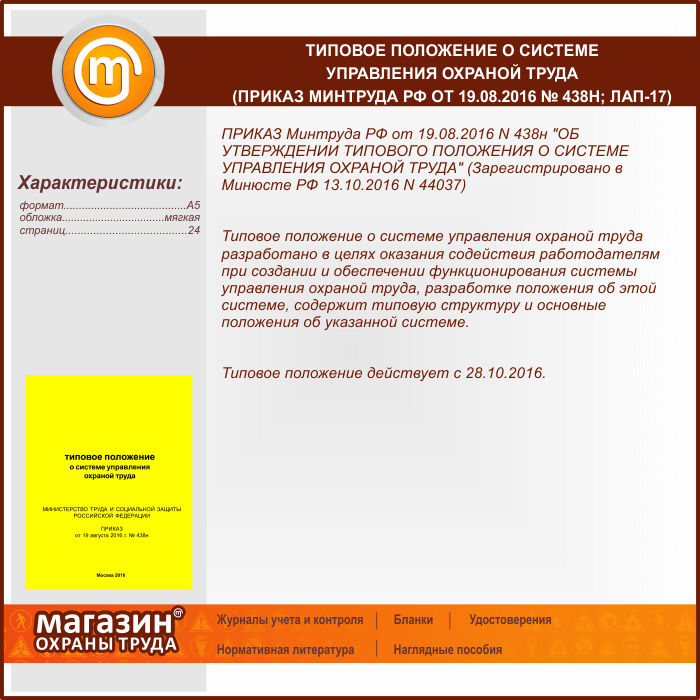 Типовое положение о системе управления охраной труда (Приказ Минтруда РФ от 19.08.2016 № 438н) (ЛАП-17) в Великом Новгороде купить