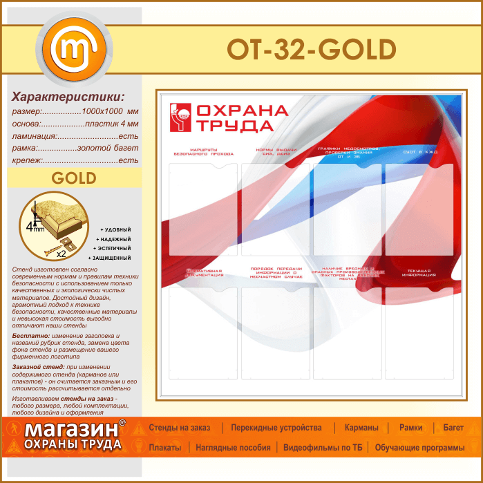 Стенд «Охрана труда» с 8 карманами (OT-32-GOLD) в Великом Новгороде купить