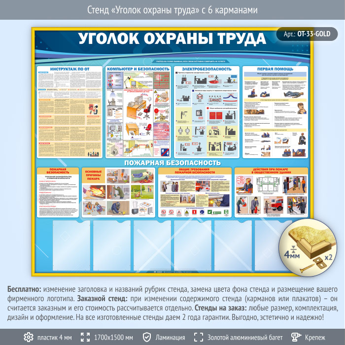 Стенд «Уголок охраны труда» с 6 карманами (OT-33-GOLD) в Великом Новгороде купить