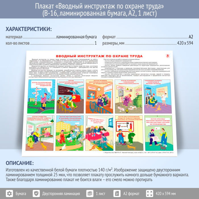 Плакат «Вводный инструктаж по охране труда» (В-16, ламинированная бумага, А2, 1 лист) в Великом Новгороде купить