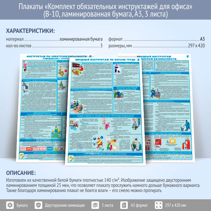 Плакаты «Комплект обязательных инструктажей для офиса» (В-10, ламинированная бумага, А3, 3 листа) в Великом Новгороде купить
