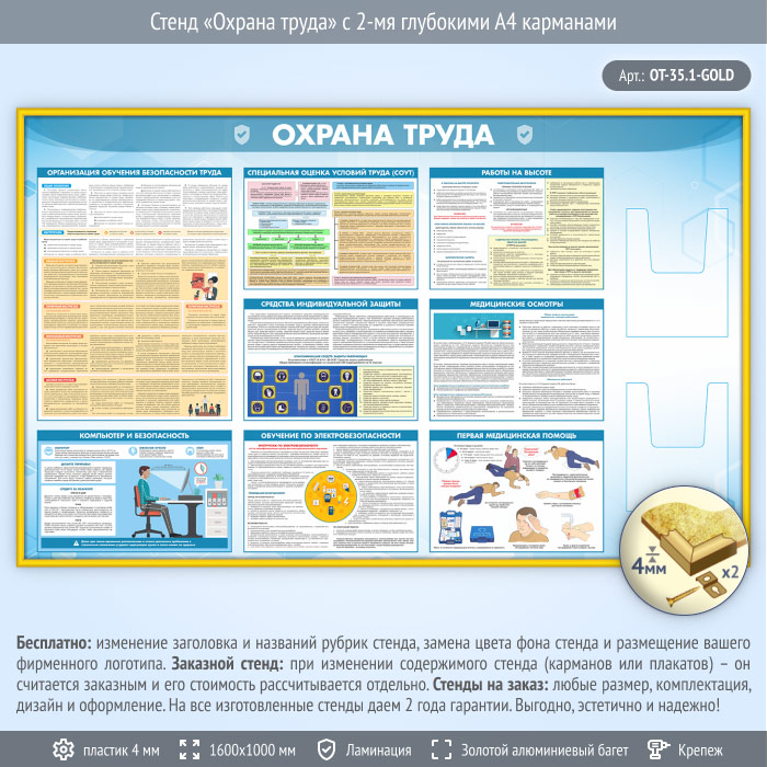 Стенд «Охрана труда» с 2-мя глубокими А4 карманами (OT-35.1-GOLD) в Великом Новгороде купить