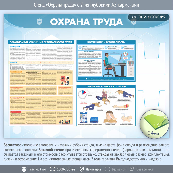 Стенд «Охрана труда» с 2-мя глубокими А5 карманами (OT-35.3-ECONOMY2) в Великом Новгороде купить