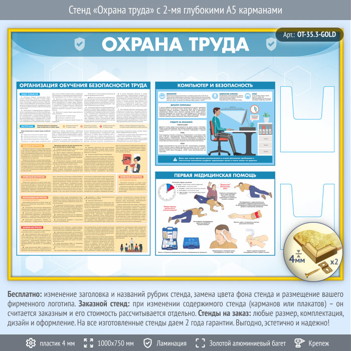 Стенд «Охрана труда» с 2-мя глубокими А5 карманами (OT-35.3-GOLD) в Великом Новгороде купить