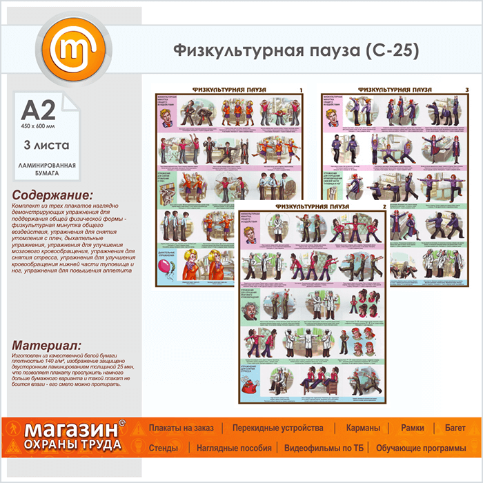 Плакаты «Физкультурная пауза» (С-25, ламинированная бумага, А2, 3 листа) в Великом Новгороде купить