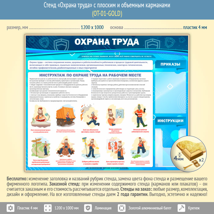 Стенд «Охрана труда» с плоским и объемным карманами (OT-01-GOLD) в Великом Новгороде купить