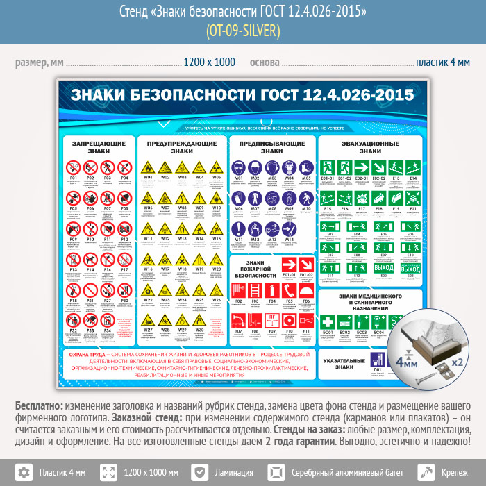 Стенд «Знаки безопасности ГОСТ 12.4.026-2015» (OT-09-SILVER) в Великом Новгороде купить