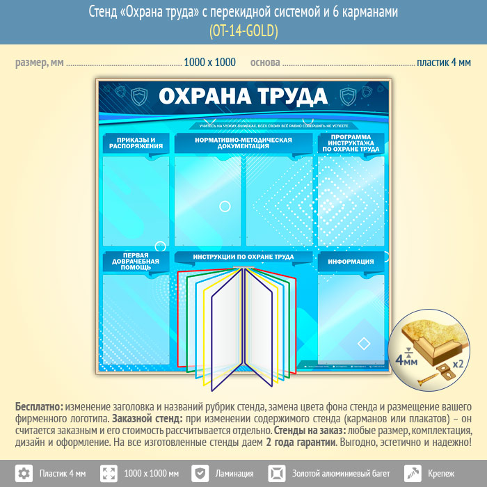 Стенд «Охрана труда» с перекидной системой и 6 карманами (OT-14-GOLD) в Великом Новгороде купить