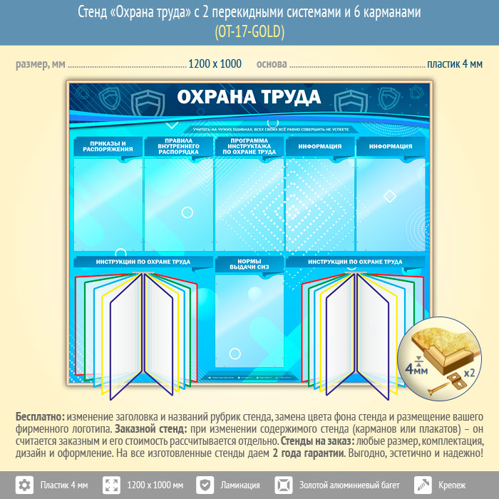 Стенд «Охрана труда» с 2 перекидными системами и 6 карманами (OT-17-GOLD) в Великом Новгороде купить