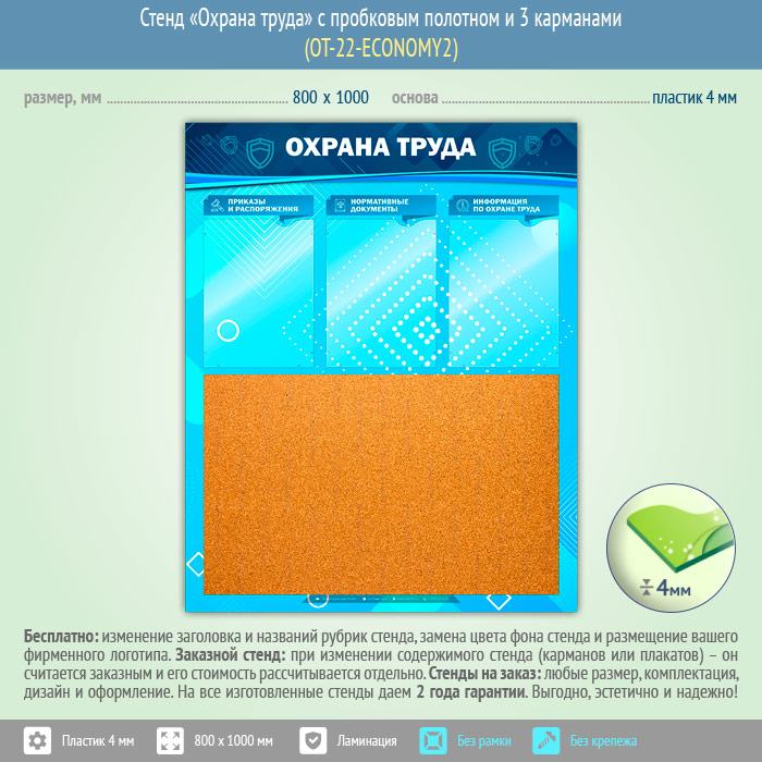 Стенд «Охрана труда» с пробковым полотном и 3 карманами (OT-22-ECONOMY2) в Великом Новгороде купить
