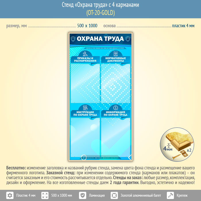 Стенд «Охрана труда» с 4 карманами (OT-20-GOLD) в Великом Новгороде купить