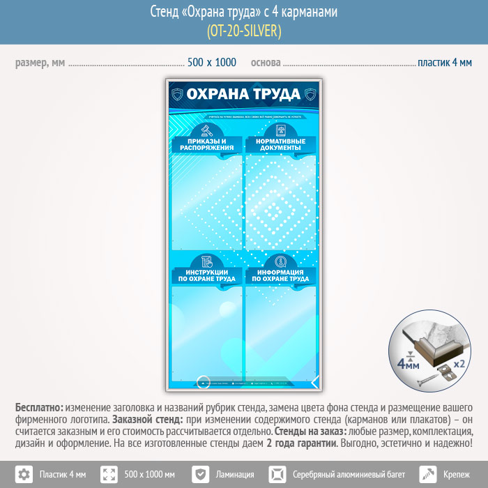 Стенд «Охрана труда» с 4 карманами (OT-20-SILVER) в Великом Новгороде купить