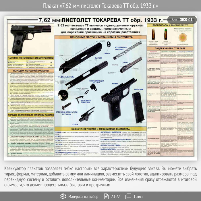 Плакат «7,62-мм пистолет Токарева ТТ обр. 1933 г.» (ОБЖ-01, 1 лист) в Великом Новгороде купить
