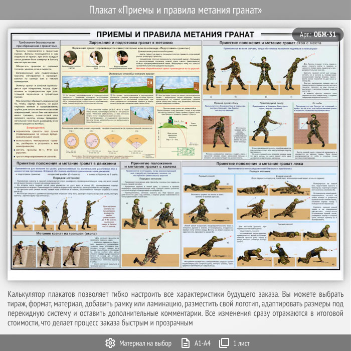 Плакат «Приемы и правила метания гранат» (ОБЖ-31, 1 лист) в Великом Новгороде купить