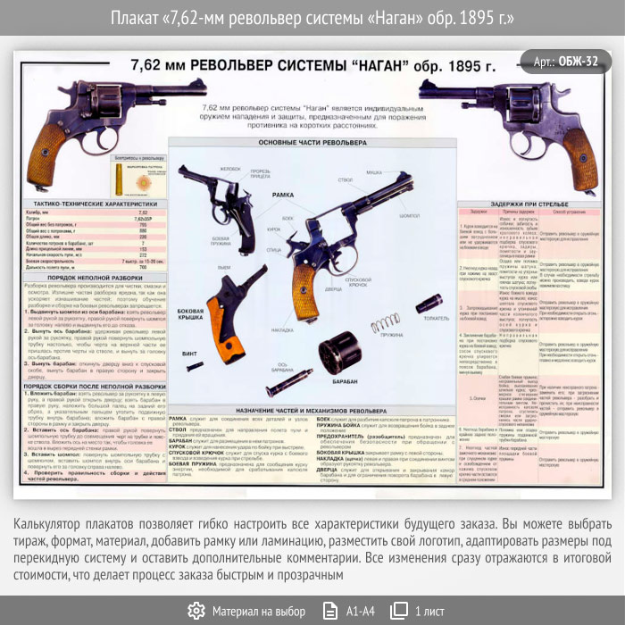 Плакат «7,62-мм револьвер системы «Наган» обр. 1895 г.» (ОБЖ-32, 1 лист) в Великом Новгороде купить