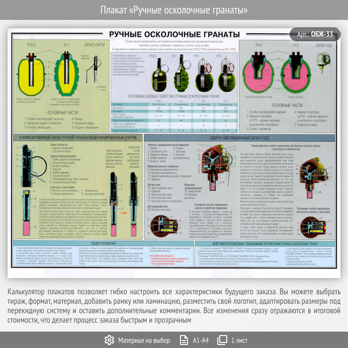 Плакат «Ручные осколочные гранаты» (ОБЖ-33, 1 лист) в Великом Новгороде купить