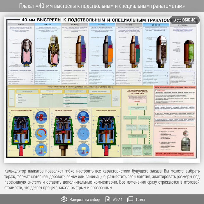 Плакат «40-мм выстрелы к подствольным и специальным гранатометам» (ОБЖ-40, 1 лист) в Великом Новгороде купить