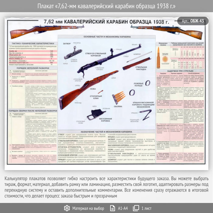 Плакат «7,62-мм кавалерийский карабин образца 1938 г.» (ОБЖ-43, 1 лист) в Великом Новгороде купить