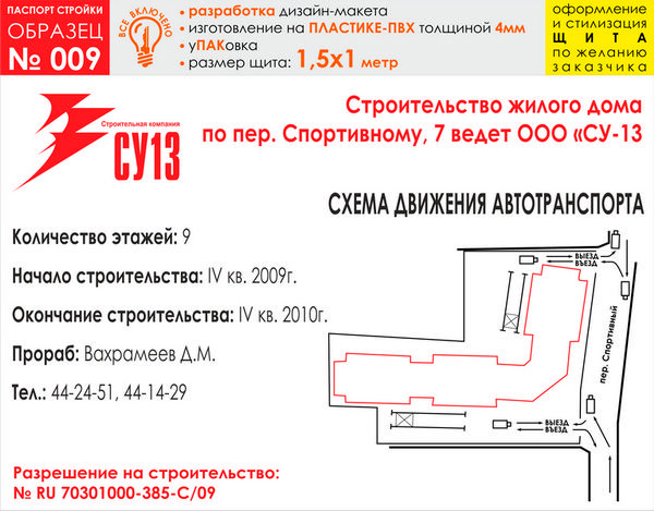 Паспорт стройки, образец № 9 (пластик 4 мм, 1500х1000 cм) в Великом Новгороде купить