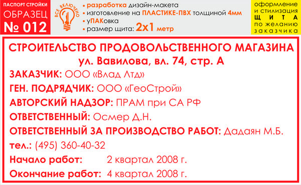 Паспорт стройки, образец № 12 (пластик 4 мм, 2000х1000 cм) в Великом Новгороде купить